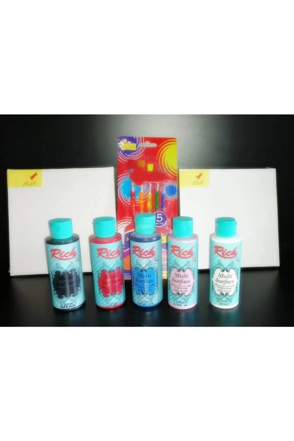 Rich multi surface 5 renk set + fırça seti ve 2 adet 18x18 tual Siyah; Beyaz; Kırmızı; Mavi; Lila;