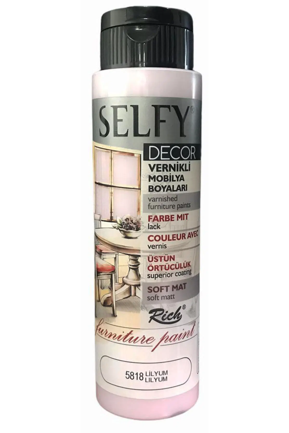 Rich Selfy Decor Vernikli Boya 500 cc 5818 LİLYUM Rich Selfy Decor Mobilya Boyaları dekoratif amaçlı olup her yüzeyde uygulanabilen su bazlı kendinden vernikli boyalardır.; ; Sulandırma gerektirmez.; ; Direk kullanıma hazırdır.; Ürün HakkındaUygulanacak olan yüzey temiz ve kuru olmalıdır.; ; Kat aralarında minimum 6 saat beklenmeli, ürün kullanılmadan önce mutlaka çalkalanmalıdır.; ; Boyama işlemi sonucunda ekstra bir vernik gerektirmez.; ; Daha parlak bir görünüm istenirse üzerine Rich High Gloss vernik sürülebilir.; ; Tam sabitlenme süresi ortalama 4-5 gündür.; ; Sağlığa zararlı madde içermez.; ; CE ve EN71 normlarına uygundur.; ; Rich Selfy Decor Vernikli Mobilya Boyaları Üstün Örtücülük Soft MatPaket İçeriği1 Adet;