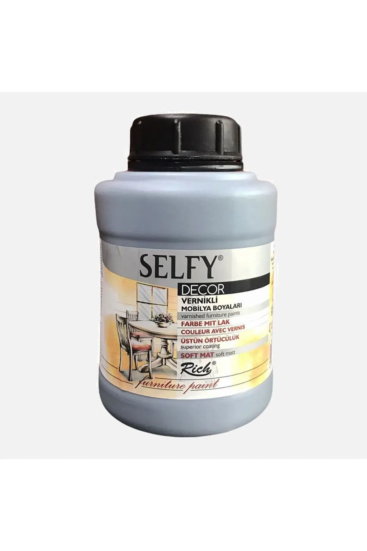 Rich Selfy Decor Mobilya Boyaları dekoratif amaçlı olup her yüzeyde uygulanabilen su bazlı kendinden vernikli boyalardır. Sulandırma gerektirmez. Direk kullanıma hazırdır.Uygulanacak olan yüzey temiz ve kuru olmalıdır.Kat aralarında minimum 6 saat beklenmeli, ürün kullanılmadan önce mutlaka çalkalanmalıdır. Boyama işlemi sonucunda ekstra bir vernik gerektirmez.Daha parlak bir görünüm istenirse üzerine Rich High Gloss vernik sürülebilir.Tam sabitlenme süresi ortalama 4-5 gündür.Sağlığa zararlı madde içermez. CE ve EN71 normlarına uygundur.Rich Selfy Decor Vernikli Mobilya Boyaları Üstün Örtücülük Soft Mat