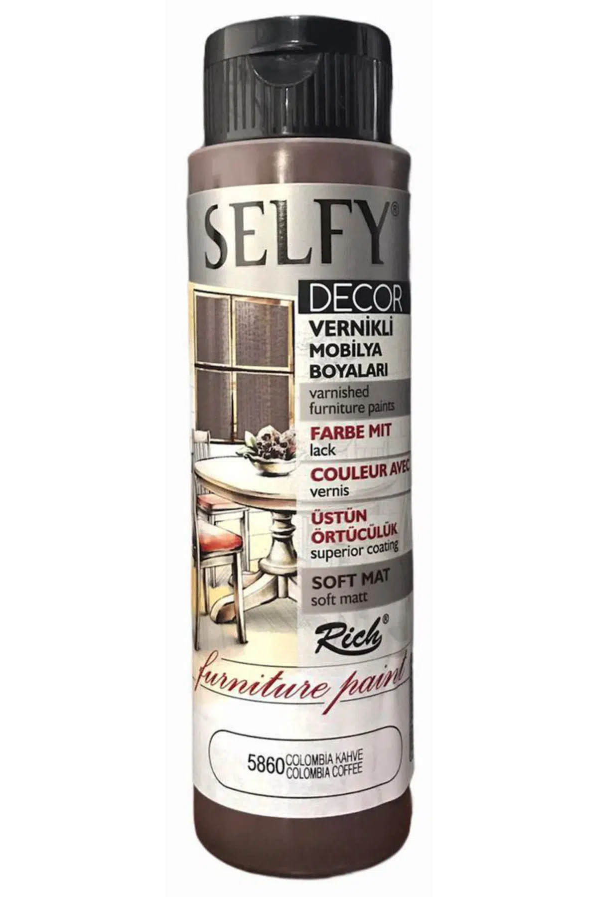 Rich Selfy Decor Vernikli Boya 500 cc 5860 COLOMBİA KAHVE Rich Selfy Decor Mobilya Boyaları dekoratif amaçlı olup her yüzeyde uygulanabilen su bazlı kendinden vernikli boyalardır.; ; Sulandırma gerektirmez.; ; Direk kullanıma hazırdır.; Ürün HakkındaUygulanacak olan yüzey temiz ve kuru olmalıdır.; ; Kat aralarında minimum 6 saat beklenmeli, ürün kullanılmadan önce mutlaka çalkalanmalıdır.; ; Boyama işlemi sonucunda ekstra bir vernik gerektirmez.; ; Daha parlak bir görünüm istenirse üzerine Rich High Gloss vernik sürülebilir.; ; Tam sabitlenme süresi ortalama 4-5 gündür.; ; Sağlığa zararlı madde içermez.; ; CE ve EN71 normlarına uygundur.; ; Rich Selfy Decor Vernikli Mobilya Boyaları Üstün Örtücülük Soft MatPaket İçeriği1 Adet;