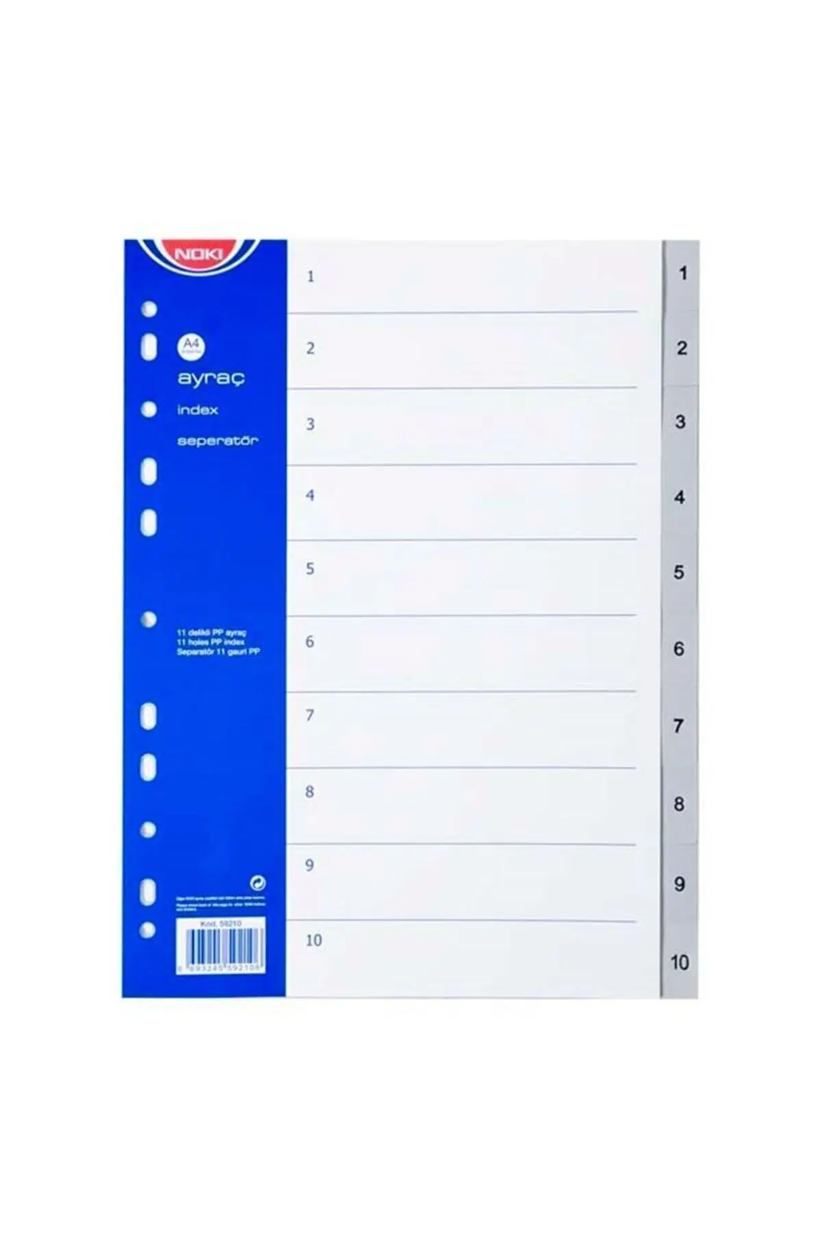 Noki Seperatör 1-10 Rakamlı Plastik A4 Dosya Ayraç Seperatör Noki Ayraç 1-10 Rakam Seperatör çeşitli evrak ve dokümanlarınızı sıralamak ve düzene sokmak için kullanılmaktadır. ; Klasör ve dosyaların boyutuna göre üretilen seperatörler genellikle A4 boyutundadır. ; Noki seperatör PP hammaddesinden üretilmiştir. ; 1’den 10’a kadar sayı ile bölünebilmek özelliği vardır, bu sayede sınıflandırmak istediğiniz belgeleri ayırmanıza hatta numaralarına göre sıralamanıza yardımcı olacaktır. ; Doğa dostu materyalleri ve güçlendirilmiş kulakçıkları ile uluslararası standartlardadır. ; Ofiste, okulda ve günlük hayatınızda büyük yardımcınız olacak olan bu seperatör sayesinde dilediğiniz zamanda dilediğiniz belgelerinizi sınıflandırabilirsiniz. ; Bu sayede karmaşaya izin vermeyerek daha düzenli ve kaliteli bir arşiviniz olacaktır. ; İş yükünüzü hafifleterek sizin için önemli olan tüm dosya ve belgeleri belirli bir sıraya göre düzenleyebilir. ; Dokümanlarınızı delmenize gerek kalmadan zarar vermeden kullanabilirsiniz. ; Dayanıklı yapısı sayesinde uzun yıllar kullanımınıza uygun tasarlanmıştır. ; Ürün Özellikleri · Dokümanları delmeden klase etmenin en kolay yoludur. ; · Doğa dostu malzemelerden üretilmiş · 11 tip deliği sayesinde her türlü klasör mekanizmasıyla uyumludur · Uluslararası standartlarda delikler · Silinmez kulakçık baskıları · A4 PP malzeme kullanılmıştır · Güçlendirilmiş delik ve kulakçıklar · Yırtılma ve ısıya dayanıklı · 1-10 rakamlarına göre sıralı · Rahat kullanım;