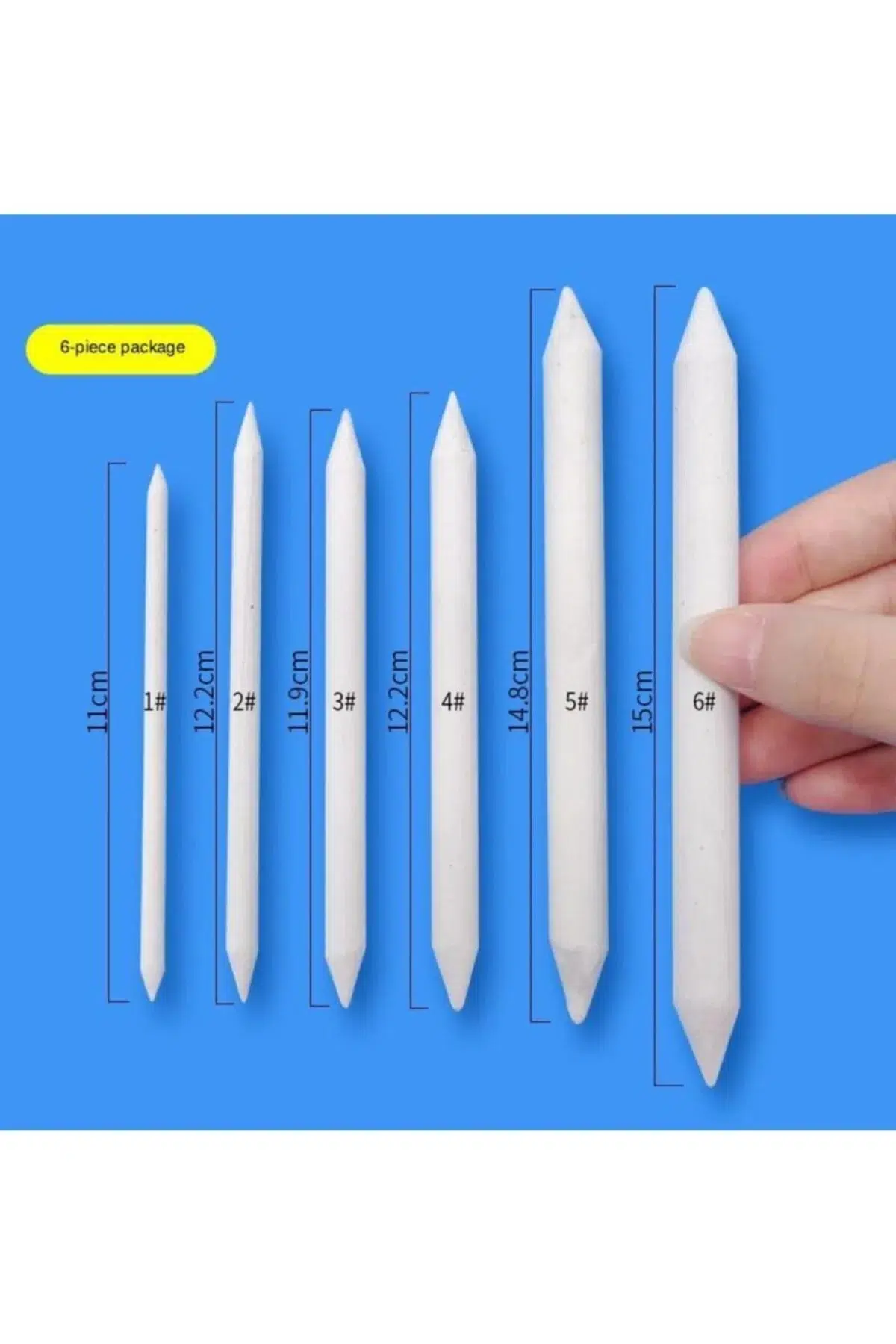 Toz Pastel Dağıtıcı – 6 Parça Set içeriğinde 1 numaradan 6 numaraya kadar farklı boyutlarda 6 adet kağıt pastel dağıtıcı kalem bulunmaktadır. Toz pastel dağıtmak ve kaynaştırmak için kullanılır. ; Pastel, füzen gibi tozlu bir malzeme ile çalışıyorsanız boyaları dağıtmak için idealdir. Kağıt yayıcılarla renk karıştırma, harmanlama ve dağıtma işlemleri çok kolay bir şekilde yaparsınız. ; Paket İçeriği: Toz Pastel Dağıtıcı, 6'lı Set , Kaynaştırma Kalemi, Paper Stump, Tortillion 1-2-3-4-5-6 Numraları ;