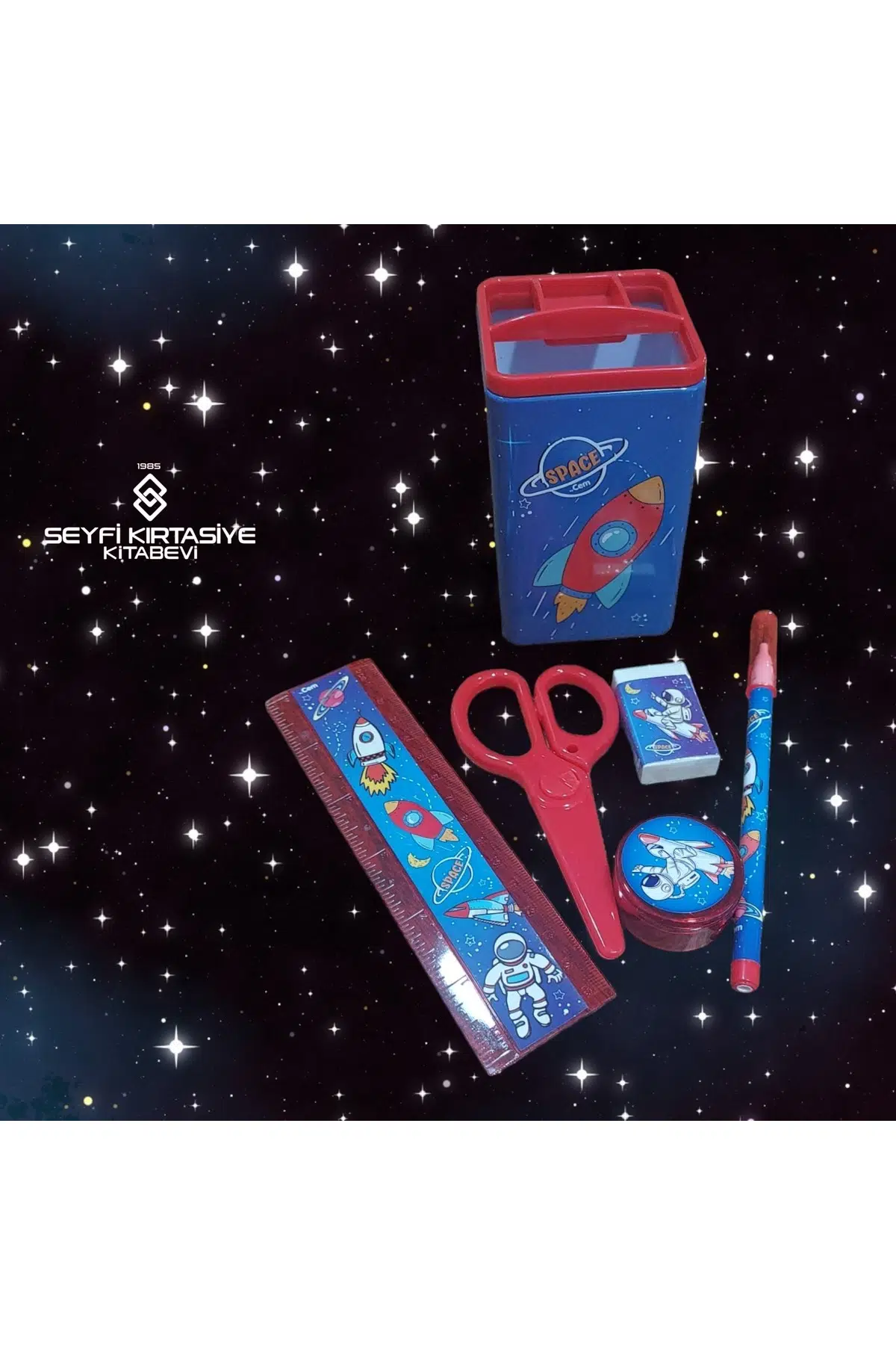 UZAY DESEN KIRTASİYE SETİ MASAÜSTÜ KALEMLİK CETVEL MAKAS KALEMTRAŞ YUMURTLAYAN KALEM SİLGİ