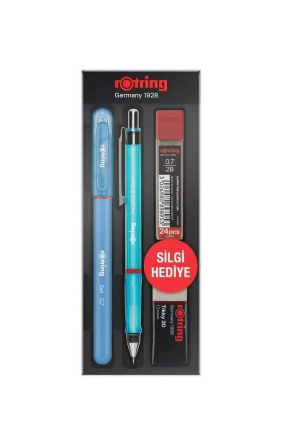 Rotring Visuclick Jel Okul Seti 0.7mm Ürün Açıklaması Rotring Visuclick Jel Okul Seti 0.7mm Öğrenci kullanımı için ideal set! Rotring şıklık ve güvenirliğinde mekanik ve jel kalem seti.; ; Üstelik set içinde silgi hediye! Mekanik Kurşun Kalem: Gizli uç mekanizması.; ; Jel kalem: Konforlu yazım için ergonomik gövde, Hızlı kuruyan mürekkep.; ; Şeffaf Plastik içinde flok malzemeye yerleştirilmiş kalem, silgi.; ; Kapak içinde gizli silgi.; ; Metal iç mekanizma.; ; Set içeriği: 1 adet visuclick 0.7 mm mekanik kurşun kalem+ 1 adet rotring jel kalem + 1 adet Tikky 30 Silgi+ 1 adet 0.7 2B Min Uç kalınlığı: 0.7 mm Ebat: 17 x 7 x 2 cm.; ; Ağırlık: 60 gr.;