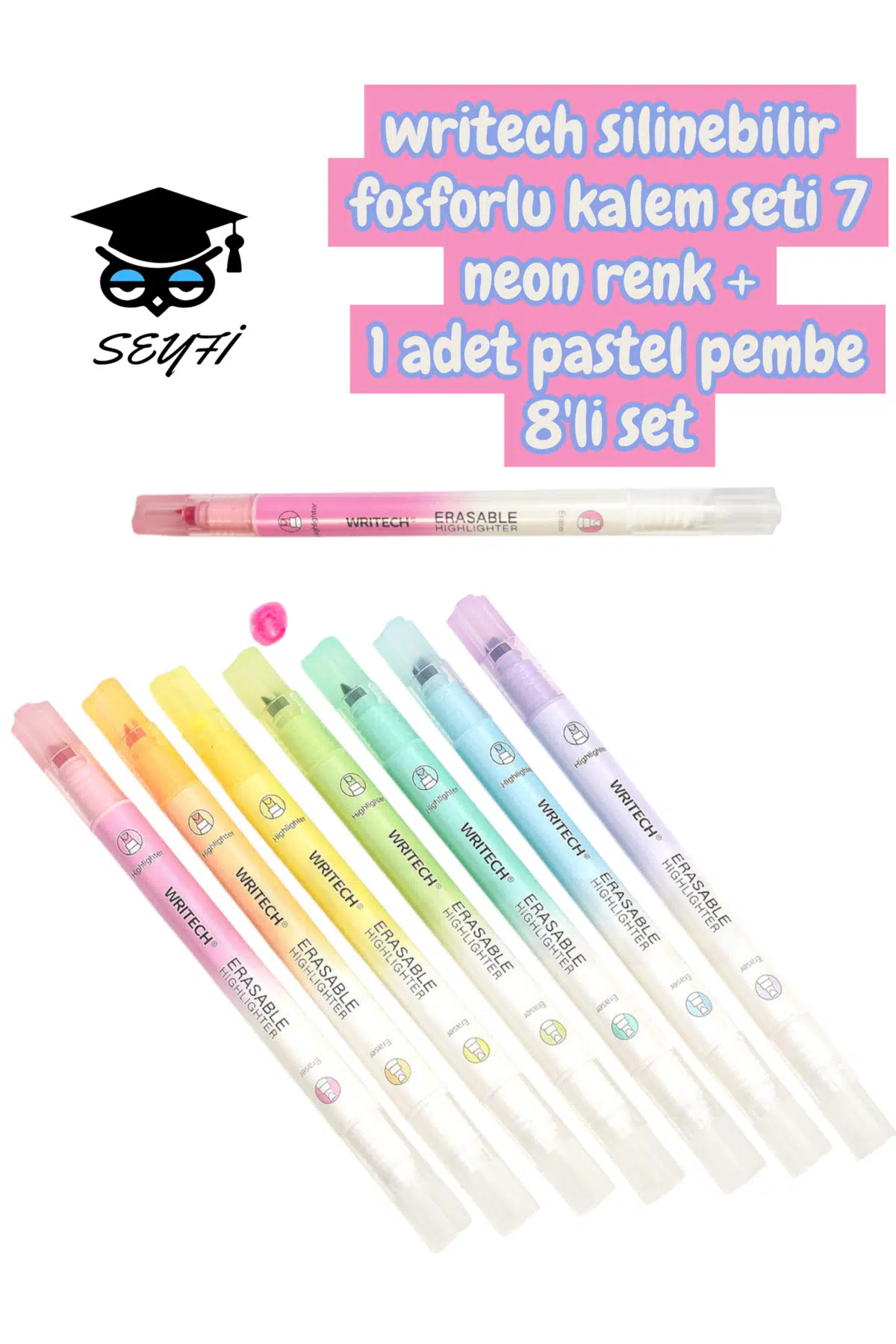 writech silinebilir fosforlu kalem seti 7 neon renk + 1 adet pastel pembe 8`li set